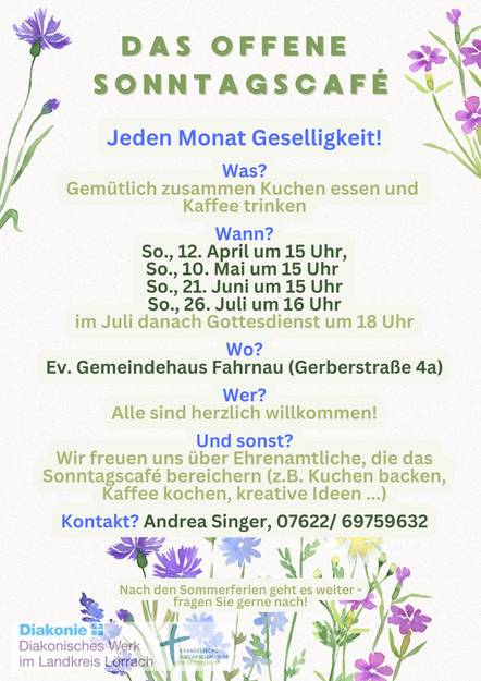 Das Offene Sonntagscafé funktioniert dann gut, wenn alle irgendetwas beitragen. Es kann ein Witz sein, über den alle lachen. Es kann ein selbst gebackener Kuchen sein, mit dem Sie andere verwöhnen. Oder ein Lied, das Sie lieber in Gemeinschaft singen.