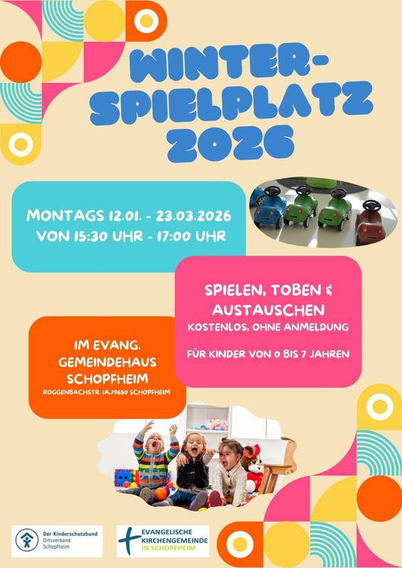 Der Winterspielplatz ist während der laufenden Saison montags von 15.30-17.00 Uhr im Saal des evangelischen Gemeindehauses Schopfheim geöffnet.