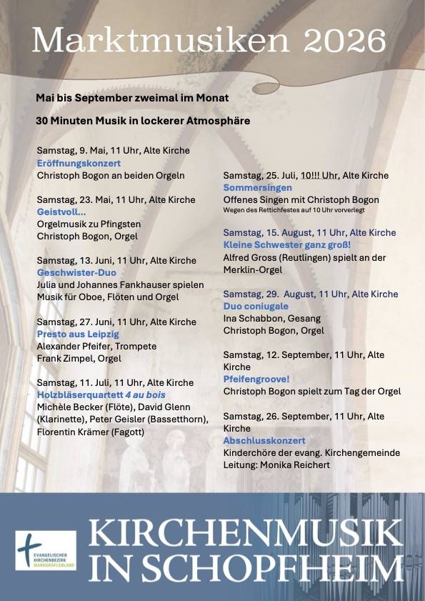 Am Samstag, den 9. Mai findet um 11 Uhr spielt Christoph Bogon an beiden Orgeln festliche Orgelmusik von Johann Sebastian Bach, Dieterich Buxtehude, Joseph Haydn und anderen Komponisten. Die Marktmusiken sind familiengerecht, der Eintritt ist frei und es gibt warme wie kalte Getränke sowie kleine Süßigkeiten für die Gäste.
