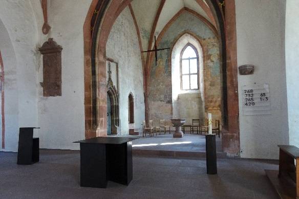 Altar, Lesepult, Osterkerze und das im Triumphbogen hängende Kreuz bestehen aus anthrazitfarbenem Stahl, sie haben einen warmen, tiefen Farbton, der vorsichtig mit den vorhandenen Wandmalereien harmoniert. Diese „Prinzipalstücke“ ziehen den Blick auf sich, sie geben dem Gotteshaus Ausrichtung und einen Schwerpunkt. Das Ensemble wurde von Nikolaus Kernbach aus Aulendorf geschaffen und am Pfingstfest 2012eingeweiht.