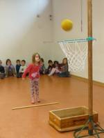 Bewegung ist eines der kindlichen Grundbedürfnisse: Kinder rennen, hüpfen, balancieren, wann immer sie die Möglichkeit dazu haben. Unsere Räumlichkeiten bieten Kindern gute Möglichkeiten, diesem Bedürfnis nachzugehen. Nach dem Frühstück ist Bewegungszeit bei uns: Unsere Turnhalle wird an Regentagen und im Kleingruppenangebot am Mittwoch für die Kinder zur Bewegungs- baustelle. Wir nutzen sie als Autobahn, Turnzimmer, Dschungel und für Bewegungsspiele. Über Bewegungsangebote lässt sich viel Lernen – die grobmotorischen Fähigkeiten werden geschult, das Sozialverhalten wird gefördert. Durch Übungen in verschieden Sozialformen wächst die Gemeinschaft zusammen. Durch da Einbringen eigener Ideen der Kinder wird die Kreativität gefördert. Wenn die Kinder neu in den Kindergarten kommen werden sie schnell vertraut mit den Regeln unserer Klassikerspiele: Feuer, Wasser, Sturm und Reise nach Jerusalem. Im Laufe der Kinder- gartenzeit entsteht oft die Motivation einmal erster bei diesen Spielen zu werden. So lernen die Kinder den Umgang mit Frust, wenn sie verlieren und wachsen in ihrem Selbstbewusstsein, wenn sie Sieger werden. Bewegung und Ruhe sind zwei Komponenten, die zusammengehören – Pausen auf der Bank gehören zum Ausruhen ebenso dazu, wie kleine Stilleübungen oder Konzentrationsübungen. In der Turnhalle herrscht oft eine ausgelassene Stimmung wenn 21 Kinder fröhlich miteinander toben. Hinterher ist wieder Muße für ein Puzzle, ein Bilderbuch oder malen im Gruppenraum.